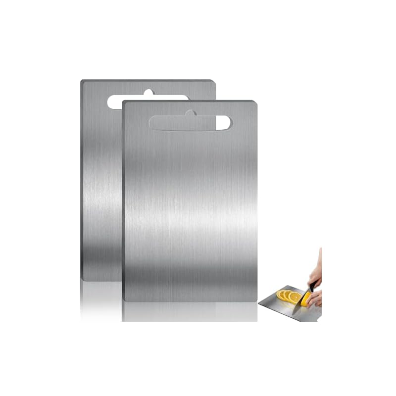 Alta calidad: nuestra tabla de cortar de titanio está hecha de acero inoxidable de alta calidad de grado alimenticio, que garantiza un corte y corte estables, y hace que las tablas de cortar de titanio sean reutilizables y resistentes para un uso a largo plazo