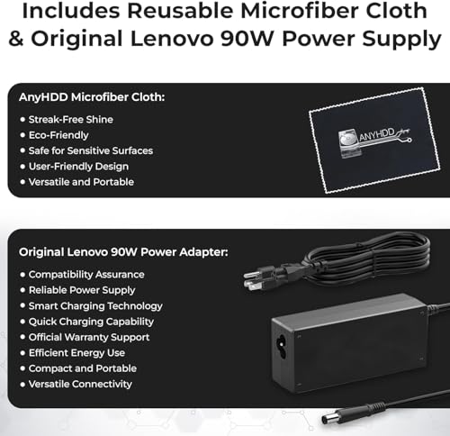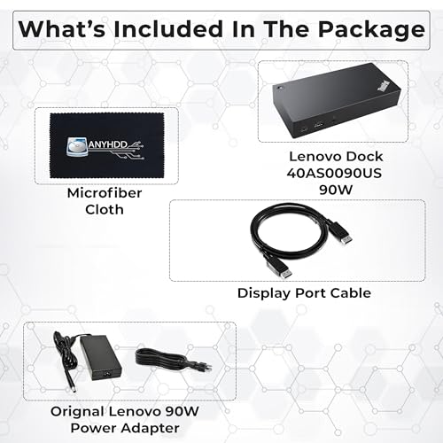 [El paquete incluye] – Base para laptop 40AS0090US renovada, adaptador de 90 W, 1 cable Displayport, paño de limpieza de microfibra