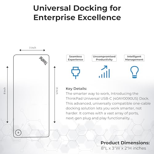 Especificaciones: 40AY0090US – Estación de acoplamiento para monitor doble, estación de acoplamiento USB C, base Thinkpad con adaptador de CA + cable HDMI + cable DisplayPort + cable USB C + paño de microfibra
