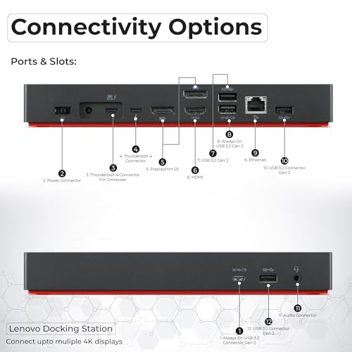 Especificaciones: 40B00135US Lenovo Thinkpad Docking Station USB C – 1 año de garantía, compatible con pantalla 4K, Thunderbolt 4 Dock con adaptador de 135 W, HDMI, DisplayPort, cables Thunderbolt y tela – Estación de acoplamiento Lenovo