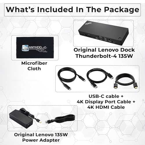 [El paquete incluye] Base Lenovo 40B00135US Thunderbolt 4, adaptador de corriente alterna de 135 W, 1 cable Thunderbolt, 1 cable HDMI 4K, 1 cable de puerto de pantalla 4K + paño de limpieza de microfibra