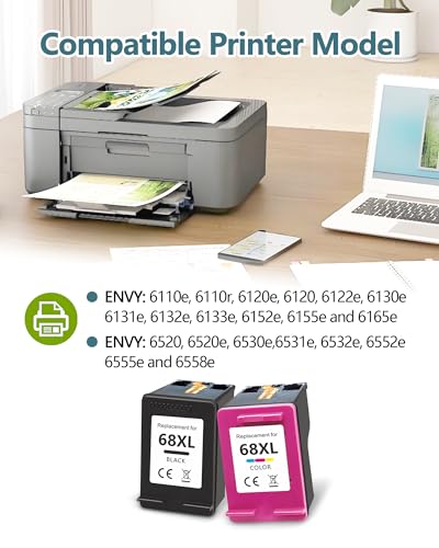 68 ink cartridges work with:Designed for Envy 6155e, 6555e, 6152e, 6558e, and 6552e printers, offering smooth compatibility and dependable results. These eco-friendly re-manufactured cartridges are fully compatible with all of the models listed above.