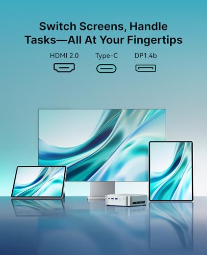 Puertos completos y conectividad de alta velocidad: diseñada para flujos de trabajo modernos, esta mini PC cuenta con 6 puertos USB 3.2, incluyendo un puerto USB-C Gen 2 con una velocidad de transferencia de datos de hasta 10 Gbps para un acceso rápido a archivos y almacenamiento externo. El puerto tipo C también admite salida de pantalla DP 1.4 (4K @60Hz) y entrega de energía PD, lo que permite una configuración de escritorio más limpia y versatile.