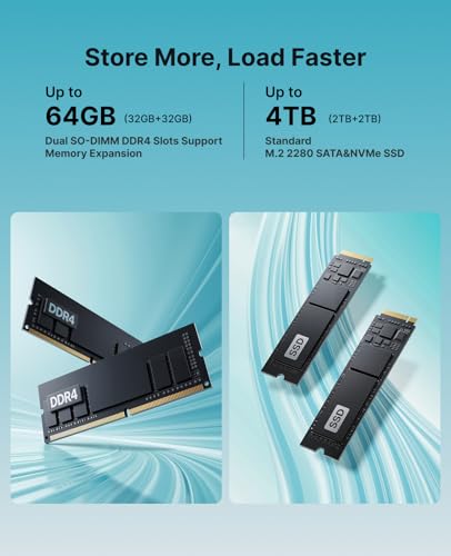 Amplio almacenamiento y opciones de actualización flexibles: esta mini computadora viene con memoria DDR4 de 16 GB, que ofrece una multitarea suave y un rendimiento eficiente para cargas de trabajo diarias. El SSD M.2 de 1TB proporciona un arranque rápido del sistema, lanzamientos de aplicaciones receptivos y acceso rápido a los datos, reduciendo significativamente los tiempos de espera. Diseñado pensando en la capacidad de expansión, soporta dos ranuras de memoria SO-DIMM de hasta 64 GB de RAM DDR4 y dos interfaces de almacenamiento M.2 2280 (1 SATA/NVMe PCIe 3.0 + 1 x SATA) de capacidad máxima de hasta 4 TB (almacenamiento no incluido). Almacene fácilmente archivos grandes, proyectos creativos y datos empresariales sin compromiso.