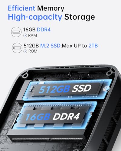 【Gran capacidad de almacenamiento】El mini ordenador está equipado con 16GB DDR4 RAM y 512GB SSD disco duro de alta capacidad, que es estable y rápido en el manejo de archivos de gran tamaño, y múltiples programas que se ejecutan al mismo tiempo sin lag.
