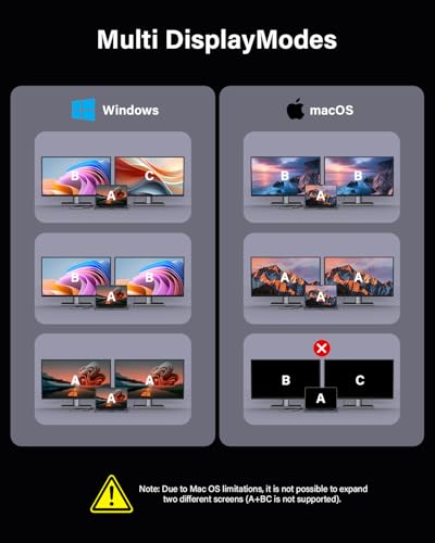 NOTA: Debido a las limitaciones de macOS, todos los modelos de MacBook solo pueden reflejar la pantalla en dos pantallas (A-A-A / A-B-B) y no pueden admitir el modo MST (Multi-Stream Transport) (A-B-C). Además, asegúrese de que el puerto USB-C de su computadora portátil sea compatible con la salida de video, ya que algunos puertos USB-C solo admiten la transferencia de datos y no se pueden utilizar con este tipo de estación de acoplamiento. La situación anterior se aplica a todas las estaciones de acoplamiento en el mercado. Estas son limitaciones de la computadora portátil, no del producto.