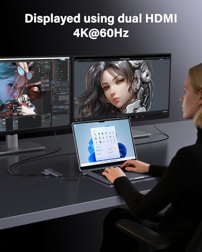 Estación de acoplamiento USB C 7 en 1 con monitor dual: amplía las capacidades de tu laptop con HDMI dual 4K @60Hz, 3 puertos USB A 3.0 (5Gbps), puerto de carga PD de 100 W, un puerto de datos USB-C de 5 Gbps, todos los puertos se pueden utilizar al mismo tiempo. Plug and Play, no se requiere instalación de controladores, puede satisfacer todas sus necesidades de conectividad en la estación de acoplamiento, hacer que su trabajo sea más eficiente.