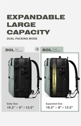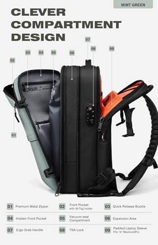 Especificaciones: AirVault – Mochila de viaje con sello al vacío de 60 litros con sistema de vacío de compresión de aire Vortex expandible resistente al agua con bloqueo TSA, Verde menta, 60 l, Bomba de vacío incluida
