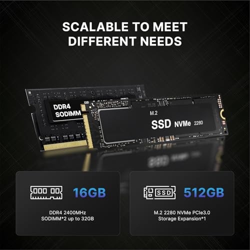 DDR4 de 16 GB y SSD de 512 GB: micro computadora DDR4 de doble canal integrada de 16 GB de RAM, reservada 1 ranura vacía (hasta 32 GB), puede manejar fácilmente la oficina multitarea, mucho más de 8 GB, decir no a la falta de memoria causada por tartamudeo, flash. Mini computadora de escritorio integrada SSD M.22280 NVMePCIe3.0 de 512 GB (flexible. Ampliable M.2 2280 NVMePCIe3.0×1 SSD), adecuado para instalar software común, datos de almacenamiento, materiales, etc.