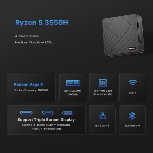 Mini PC Ryzen 5 mejorada: la mini PC MAGICNUC AS1 está equipada con el procesador Ryzen 5 3550H (4C/8T, hasta 3.7 GHz). Las mini computadoras de escritorio proporcionan una experiencia suave y rápida en multitarea, como ejecutar múltiples programas simultáneamente, actualizaciones de fondo, navegación multipestaña, operaciones diarias de oficina y carga web.
