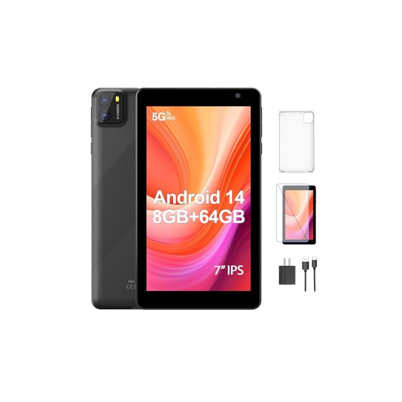 Especificaciones: BAKEN Tablet Android 13 de 7 pulgadas, 4 GB + 32 GB de memoria, WiFi 5G, procesador de cuatro núcleos, doble cámara, Bluetooth, pantalla IPS (negro)