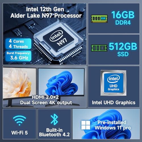 BAMX Mini Pc N97 (up to 3.6GHz)|16GB DDR4 512GB ROM Win-11 Pro|B4Pro 4K UHD Mini Ordenador|HDMI×2,BT4.2,4X USB,RJ45|Dual HDMI Display |Mini Computer Micro PC para Negocios