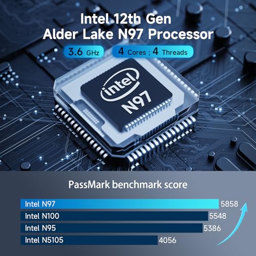 【OBTENGA UNA MINI PC NUEVA Y MEJORADA】 Resuelva cualquier problema que tenga con el ultrarrápido Alder Lake N97 de 12.a generación, un chip de 12 vatios, 4 núcleos y 4 hilos que admite velocidades de CPU de hasta 3,6 GHz. En comparación con los procesadores N95 y N100, el rendimiento de la microcomputadora N97 mejora entre un 20% y un 40% con respecto a la generación anterior. Empiece a trabajar inmediatamente. Luego utilice sin problemas todas las aplicaciones que necesita para potenciar su jornada laboral.