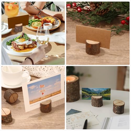 MATERIAL NATURAL: El soporte tarjetas mesa boda está hecho de material de madera maciza, cada soporte notas madera tiene una apariencia única, y la base cilíndrica es firme y estable. Grueso y fuerte, no es fácil de romper, simple en apariencia, hermoso y práctico