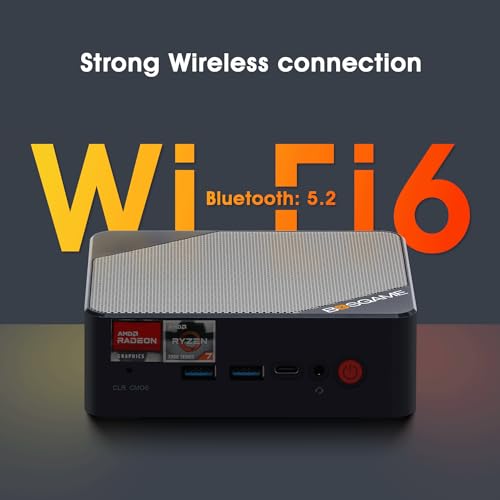 🔥【WiFi6 & BT5.2 & 2.5Gbps LAN】BOSGAME Mini PC tiene un puerto LAN Ethernet de 2.5Gbps que proporciona alta velocidad y transferencia de datos confiable, puertos USB-A 3.2 Gen2(10Gbps) y USB-C4.0. La interfaz USB-C4.0 tiene una especificación de 40Gbps. Las mini computadoras 7735HS equipadas con WiFi 6 y Bluetooth 5.2 son más rápidas y estables en la transmisión de datos y no hay desorden de la red.