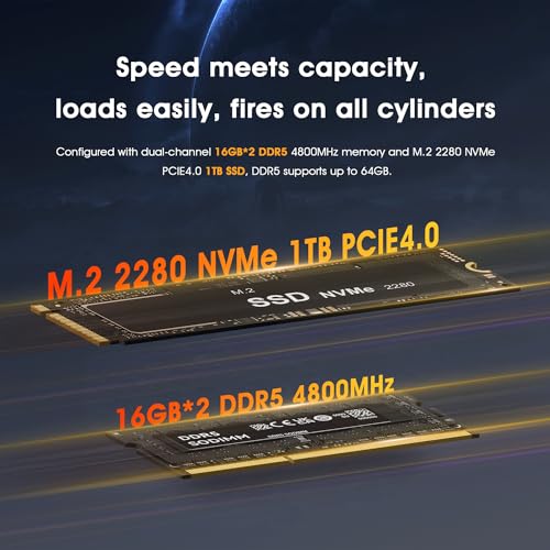 🔥【32GB DDR5 RAM y 1TB PCIe SSD】Ryzen mini pc viene con 32GB DDR5 RAM. DDR5 de doble canal ampliable hasta 64 GB (2 x 32 GB). SSD M.2 PCIe4.0 2280 de 1 TB (ampliable a 2 TB máximo). Admite un disco duro externo de 2,5 pulgadas y 7 mm con una capacidad máxima de 2 TB (no incluido). Potentes capacidades de carga y procesamiento para una experiencia más fluida.