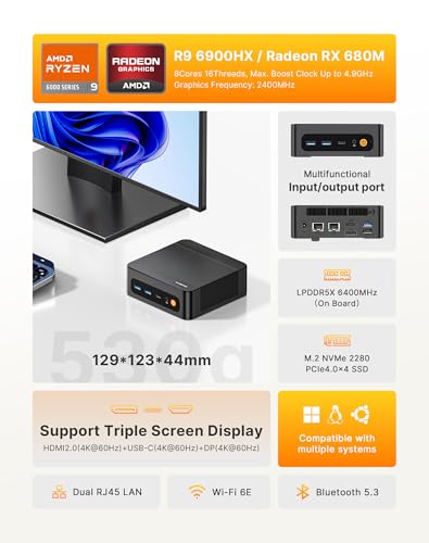 BOSGAME Mini PC de escritorio P6 Ryzen 9 6900HX, 32 GB LPDDR5 6400 MHz, 1 TB NVme 2280 SSD (ranura dual SSD), Dual LAN, WI-FI 6E, BT 5.3, oficina, escritorio para juegos, zoom, computadoras para