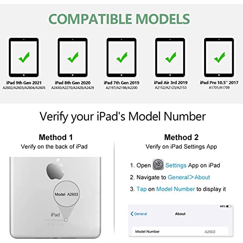Funda para iPad con teclado de 10.2/10.5 pulgadas: funda de teclado para iPad de 9ª generación de 10.2 pulgadas 2021 (modelo: A2602/A2603/A2604/A2605), para iPad de 8ª generación de 10.2 pulgadas 2020 (modelo: A2270/A2428/A2429/A2429/A2429/A205) 2430), para iPad 2019 7ª generación de 10.2 pulgadas (modelo: A2200/A2197/A2198), para iPad Air de 3ª generación de 10.5 pulgadas 2019 (modelo: A2123/A2152/A2153/A2154) y para iPad Pro de 10.5 pulgadas 2017 (modelo: A2123/A2152/A2153/A2154) 1701/Aa 1709/A1852). Comprueba tu modelo de iPad antes de comprar.