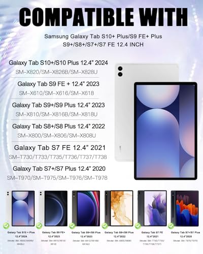 Compatibilidad: la funda es compatible con tabletas de 12,4 pulgadas: Samsung Galaxy Tab S10+/S10 Plus 2024 (Modelo: SM-X820/X826B/X828U), Samsung Galaxy Tab S9 FE+ /S9 FE Plus 2023 (Modelo: SM-X610/X616/X618), Samsung Galaxy Tab S9 Plus/S9+ 12.4 pulgadas 2023 (Modelo: SM-X810/X816B/ X818U), Samsung Galaxy Tab S8 Plus/S8+ 12.4 pulgadas 2022 (Modelo: SM-X800/X806/X808U), Samsung Galaxy Tab S7 FE 5G 12.4 pulgadas 2022 21 (Modo) el: SM-T730/T733/T735/T736/T738), Samsung Galaxy Tab S7 Plus/S7+ 12.4 pulgadas 2020 (Modelo: SM-T970/T975/T976/T978), no es compatible con ninguna otra tableta. Especialmente no es compatible con Samsung Galaxy Tab S9 de 11 pulgadas o Samsung Galaxy Tab S9 FE/S10 FE de 10.9 pulgadas
