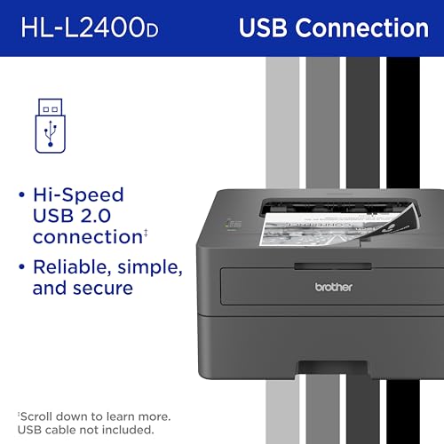 Lo mejor para uso personal y oficinas en el hogar: una impresora ideal para uso doméstico, la impresora láser monocromática Brother HL-L2400D (blanco y negro) se conecta simple y localmente a una sola computadora a través de interfaz USB. Cable USB no incluido. La impresora no tiene capacidad inalámbrica (Wi-Fi). Compatible solo con Windows y Linux.