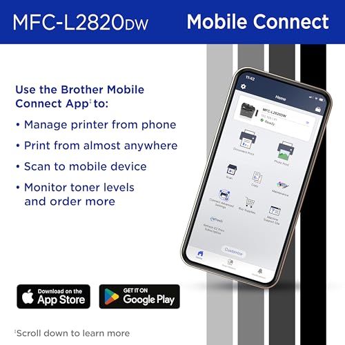 BROTHER Aplicación de conexión móvil: imprime, escanea y administra tu impresora inalámbrica en cualquier momento, desde casi cualquier lugar desde tu dispositivo móvil. Pide suministros originales de Brother y realiza un seguimiento del uso del tóner y completa más trabajo sobre la marcha (6)