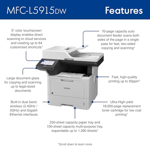 Especificaciones: Brother MFC-L5915DW Impresora láser multifunción monocromática todo en uno, redes inalámbricas, impresión y escaneo móviles, impresión dúplex, copia y escaneo, lista para reabastecimiento de Amazon