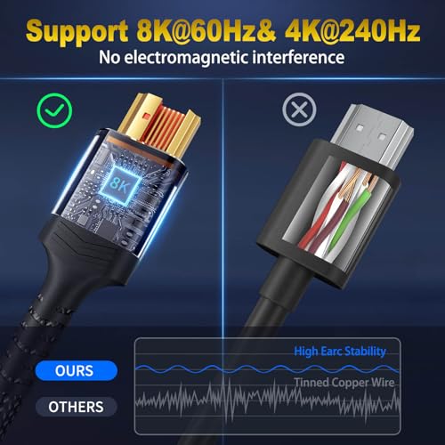 🚀[Cable HDMI real 8K a 60HZ]: este cable HDMI 8K utiliza la tecnología más avanzada para procesar con precisión cada partícula de señal y mostrar claramente cada fuente de señal, transferencia a velocidad del rayo. Puede lograr una resolución de 7680×4320, admite alta frecuencia 8K @60Hz, 4K @120Hz, 8K único y actualizado HDR, EARC, VRR y tecnología de procesamiento de color de 12 bits, y tiene un mayor nivel de mejora en audio y color, escenas de video, ¡las escenas 3D son más realistas!