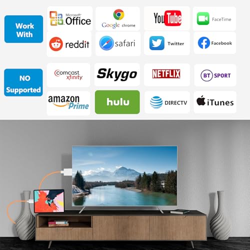 Aplicaciones compatibles: el adaptador Lightning a HDMI admite una variedad de aplicaciones, incluyendo YouTube, Hulu Plus, IDMB, Quickly, Family On TV, ABC, NBC y FOX, junto con videos locales. Ten en cuenta que no funciona con aplicaciones que tengan protección de derechos de autor de video «HDCP», como Netflix, Prime Video, Amazon Video, HBO Go, Hulu, etc. Disfruta de una amplia gama de contenido en tu plataforma preferida.