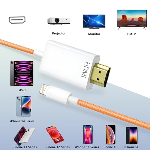 Especificaciones: Cable Lightning a HDMI para iPhone, adaptador digital AV 1080P, conector de pantalla de sincronización de video HD, iPhone a HDMI para proyector de TV, soporte para iOS 18, tejido naranja