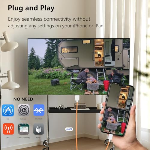 Plug and Play: con nuestro adaptador HDMI para iPhone, conecta tu iPhone a la TV directamente sin necesidad de un cable HDMI adicional. Es la solución perfecta para una conectividad perfecta entre tu iPhone y TV, proyector o monitor. Con una longitud de 6.6 pies y una construcción duradera, puedes disfrutar de audio nítido y video de alta definición con facilidad. Disfruta de una conectividad perfecta sin ajustar ninguna configuración en tu iPhone o iPad.