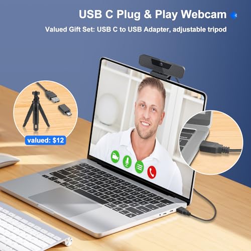 Cámara web 4K con autofoco para PC, 4 micrófonos AI con cancelación de ruido, corrección de luz automática, cámara web para computadora con FOV de 85°, cámara web USB C Plug&Play con trípode y