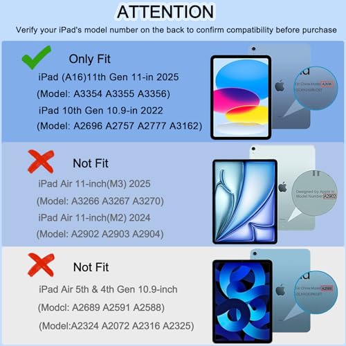 Compatibilidad: diseñado para iPad (A16) 11ª generación de 11 pulgadas/10.9 pulgadas (modelo incluye: A3354/A3355/A3356/A2696/A2757/A2777/A3162) lanzado en 2025/2022. Revisa la parte inferior de tu iPad para encontrar el número de modelo. NOTA: Esta funda no incluye un protector de pantalla incorporado.