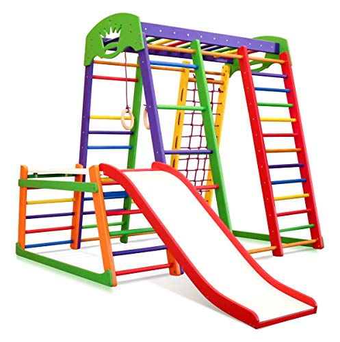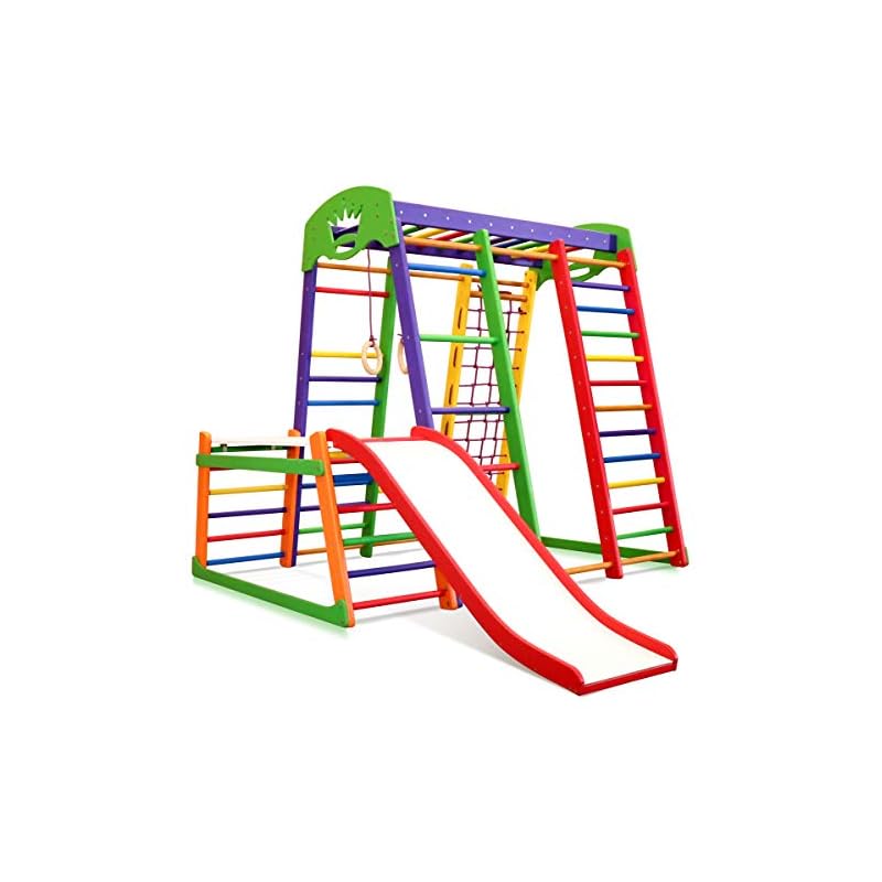 El paquete incluye: escalera sueco, red de escalada, anillos, un tobogán para los niños, tabla+escalera.