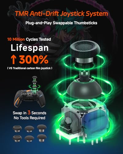 Módulo de joystick mejorado: el joystick electromagnético TMR ofrece un rendimiento antideriva awesome sobre el efecto Corridor; incluye 3 pares de tapas intercambiables (cóncavas/abovedadas/altas); el reemplazo sin herramientas se adapta a diferentes estilos de agarre