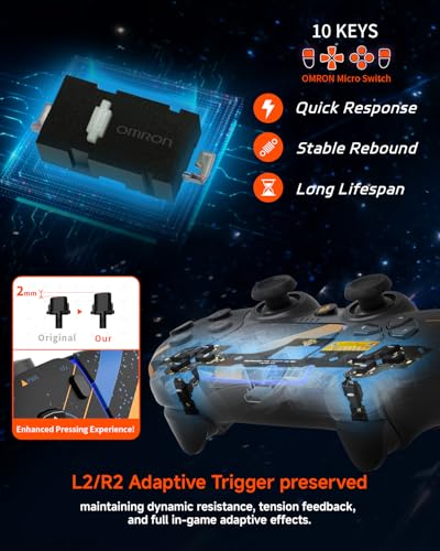 Actualización de interruptores Omron de 10 botones: Equipado con micro-interruptores Omron en el D-pad, botones frontales y L1/R1 para una activación más rápida y una respuesta nítida tipo clic de ratón; preserva la funcionalidad completa del gatillo adaptativo L2/R2