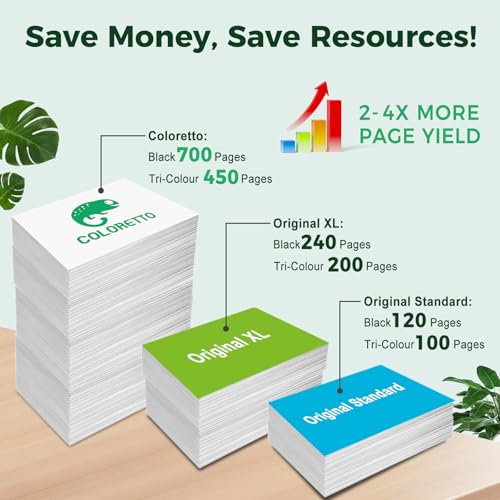 Chip y alto rendimiento de página: la tecnología de chip inteligente permite la lectura del nivel de tinta en tiempo real; hasta 650 páginas por cartucho de tinta negra COLORETTO 63XL (0.7 fl oz) y 450 páginas por tinta de color (0.7 fl oz) para tinta HP 63 XL (basado en una cobertura del 5% de papel A4)