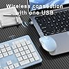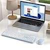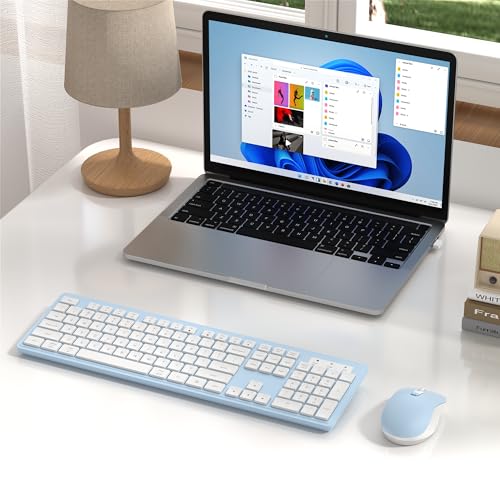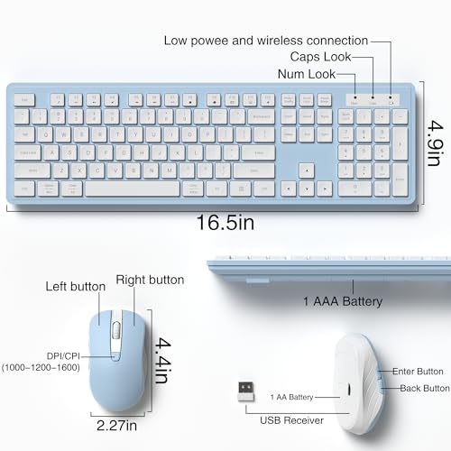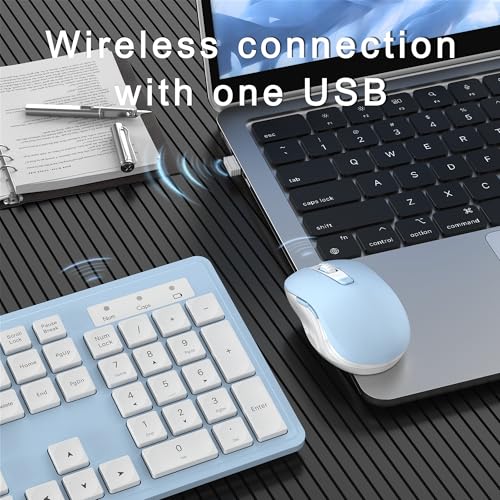 Especificaciones: Combo de teclado y mouse inalámbricos, teclado de oficina de tamaño completo de 104 teclas con 15 teclas de función, teclado numérico, receptor USB único, compatible con PC y portátil (azul
