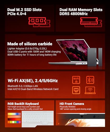 【Más ligero con refrigeración eficiente】L. a. pc para juegos FIREBAT cuenta con una gran batería de 5200 mAh 80 Wh, ofreciendo el mismo excelente rendimiento ya sea que funcione con batería o enchufado. El diseño totalmente metálico ACD utiliza grasa térmica altamente eficiente, un sistema de enfriamiento interno silencioso con ventiladores duales, tres tubos de calor en línea y salidas de aire duales, logrando un bajo nivel de ruido de aproximadamente 48 dB al nivel del oído, asegurando una refrigeración cómoda incluso cuando está inclinado o jugando durante períodos prolongados.