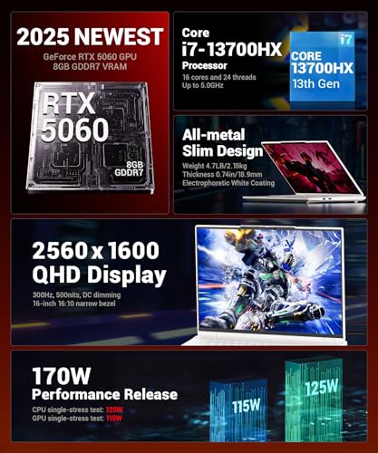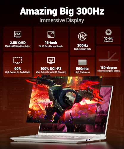 Especificaciones: Computadora para juegos portátil【300Hz/5060/i7/1TB/Dual RAM】 2560×1600 16:10 WQXGA | GPU RTX 5060 | CPU Intel Core i7-13700HX | Retroiluminación RGB | RAM DDR5 | SSD PCIe4.0 | Laptop de metal blanco Cuaderno gamer