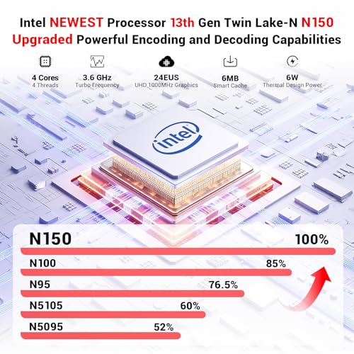 Ejecuta un rayo rápido: la laptop FIREBAT está equipada con el procesador Intel de 13ª generación Twin Lake N150 (nuevas versiones 2025, 4 núcleos/4 hilos, caché inteligente de 6 MB, velocidad turbo de hasta 3.6 GHz) y tecnología Super Fin mejorada. Ofrece una mejora de rendimiento más potente, más del 30% superior a la de la 12ª generación (N100, N97, N95) y más del 60% superior a la de la 11ª generación (N5105, N5095, J4125).