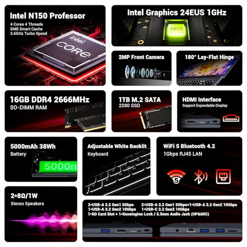 Especificaciones: Computadora portátil de 15.6 pulgadas, teclado retroiluminado, 1TB SSD 16 GB de RAM, Quad-Core N150 3.6GHz, cámara web, portátil IPS FHD portátil para estudiantes/universidad/escuela/negocios/juegos de luz/hogar【AT15】