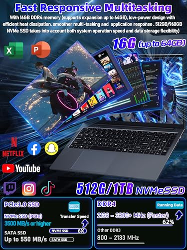 SSD NVMe de 16 GB y 512 GB/1 TB multitarea sin esfuerzo: esta computadora portátil de 17.3 pulgadas tiene 16 GB de RAM y SSD NVMe de 512 GB/1 TB. Proporciona espacio de almacenamiento masivo para archivos enormes, para que pueda almacenar datos digitales importantes y trabajar con facilidad. SSD NVMe de lectura y escritura 6-7 veces más rápido que el SSD SATA tradicional, proporcionando un amplio espacio de almacenamiento para documentos, medios y programas. ¡Haz que tu trabajo o estudio sea más conveniente!