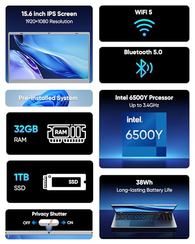 Especificaciones: Computadora portátil, FHD IPS de 15.6 pulgadas, Pentium 6500Y, 32 GB de RAM, SSD de 1 TB, WiFi 5, BT5.0, obturador de privacidad, para oficina, medios de comunicación, uso doméstico, color plateado