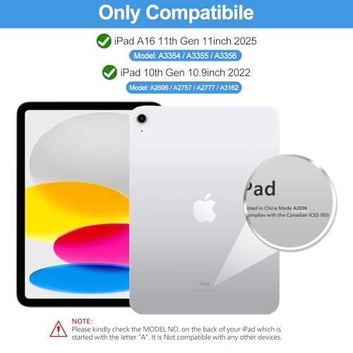 Modelo de compatibilidad: esta funda de teclado es compatible con iPad A16 de 11ª generación de 11 pulgadas 2025 (modelo: A3354/A3355/A3356) y compatible con iPad de 10.9 pulgadas 2022 (modelo: A2696/A2757/A2777/A3162). No es compatible con otros modelos. *Comprueba el número de modelo que comienza con «A» en la parte posterior de tu tableta antes de comprar. Nota: Lápiz y iPad no incluidos)