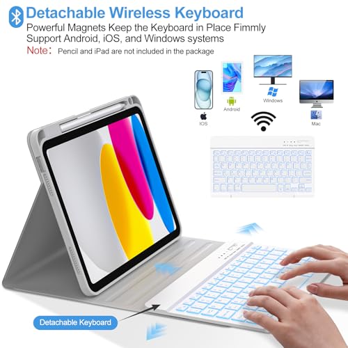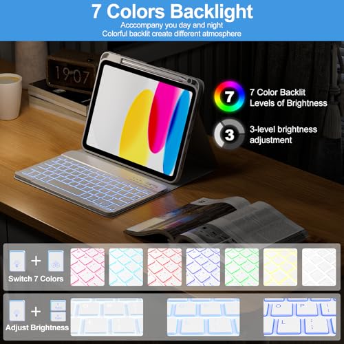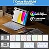 Especificaciones: COO Funda para iPad 11/10ª generación con teclado (11 pulgadas, A16 2025 y 10.9 pulgadas 2022), 7 colores retroiluminados, inalámbrico, desmontable, Bluetooth, con soporte para lápices, encendido y