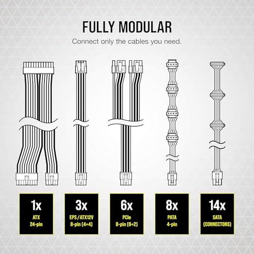 CORSAIR Las fuentes de alimentación totalmente modulares de la serie RM1000x con conectores EPS12V están construidas con componentes de la más alta calidad para entregar energía eficiente 80 PLUS Gold a su PC. Las unidades de alimentación RM1000x utilizan solo condensadores japoneses de 221.0 °F, para una larga vida útil y fiabilidad respaldadas por una garantía de diez años. Un ventilador de cojinete de levitación magnética de 5.315 in garantiza un alto rendimiento junto con un bajo nivel de ruido.
