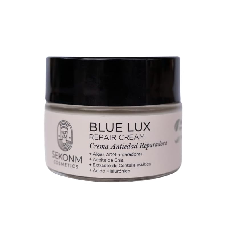 Especificaciones: Crema Facial Antiedad Reparadora de Centella Asiática, Ãcido Hialurónico, Algas reparadoras y Aceite de ChÃa. Natural y Vegano. Libre de tóxicos y alérgenos. 50ml.