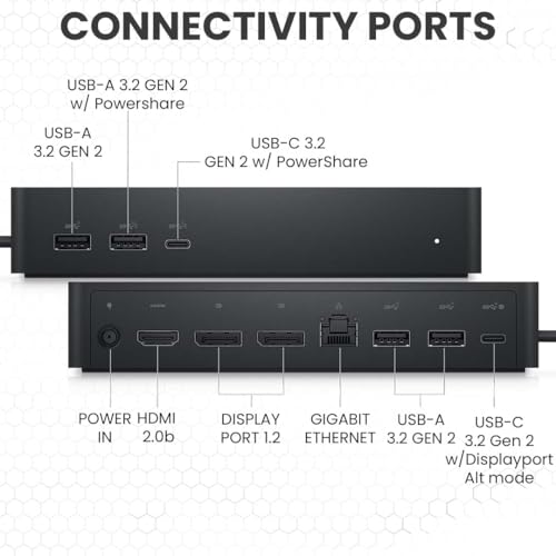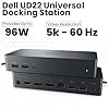 Mayor cantidad de puertos: la estación de acoplamiento universal Dell UD22 viene con 4x USB A 3.2 Gen 2, 2x USB-C 3.2 Gen 2, 2x Displayport, 1x HDMI, 1x, Gigabit Ethernet; Base universal fácil de instalar, plug and play. Conecte todos sus periféricos a través de un cable y elimine el desorden