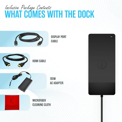 [El paquete incluye] Estación de acoplamiento WD19TBS, original 180, 1 cable HDMI, 1 cable Displayport, paño de limpieza de microfibra.