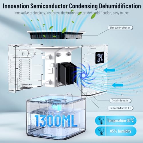 Especificaciones: Deshumidificador Eléctrico, Deshumidificadores de Humedad Silencioso 1300ml, Bajo Consumo, Temporizador 24 Horas, Apagado y Descongelación Automático, Contra Humedad para Dormitorio, Armario, Baño